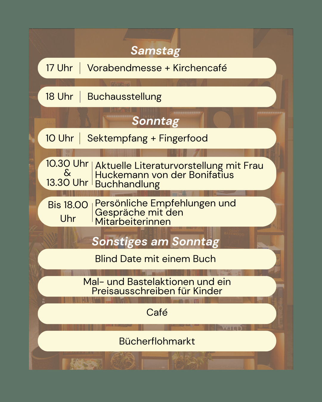Besondere Programmpunkte sind die Buchvorstellungen um 10.30 und um 13.30 mit Frau Huckemann von der Bonifatiusbuchhandlung und das Blind Date mit einem Buch - lassen Sie sich überraschen! 🤫🤭